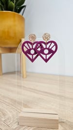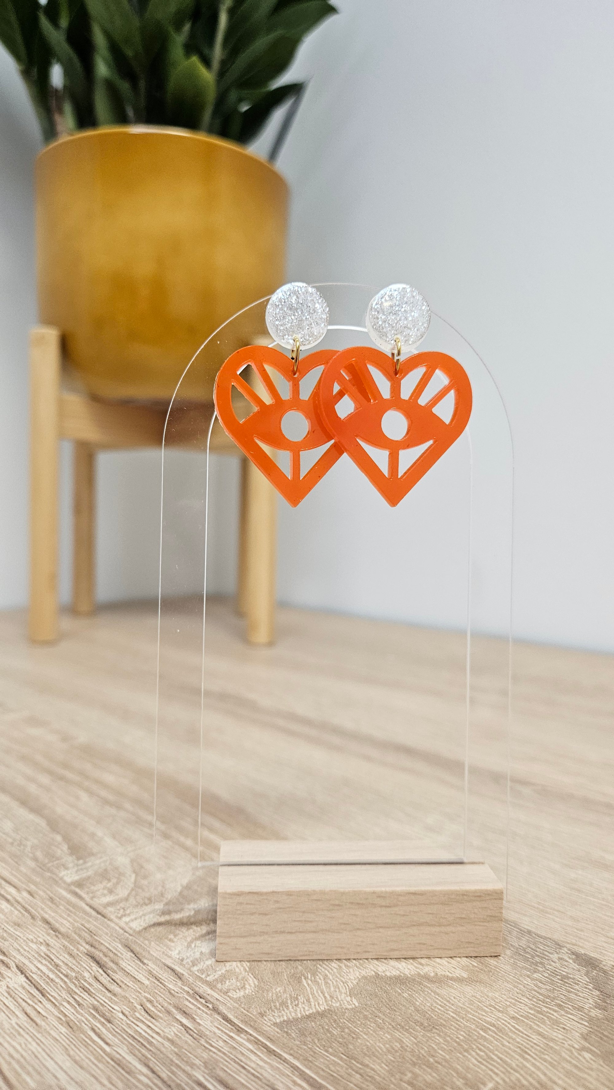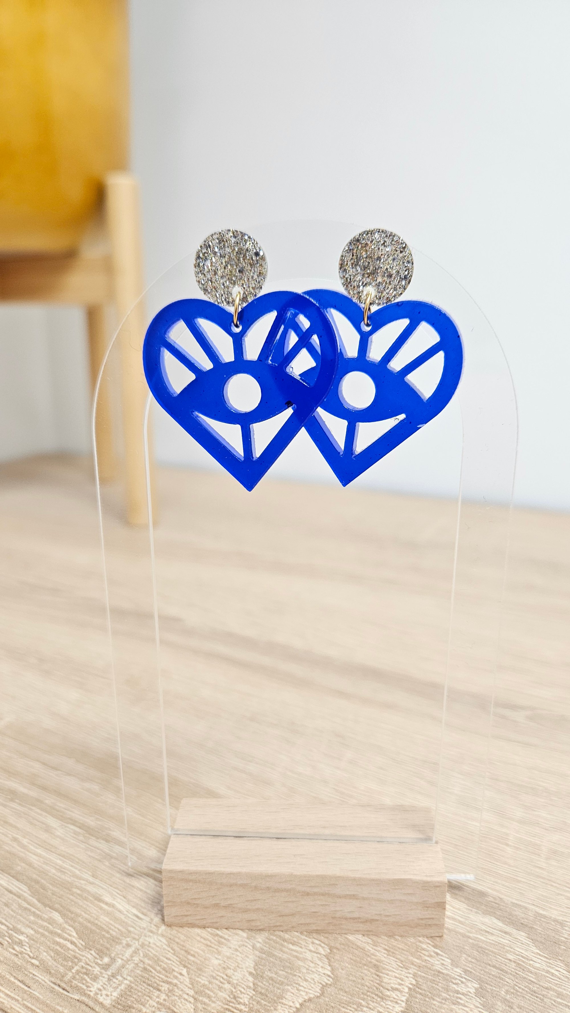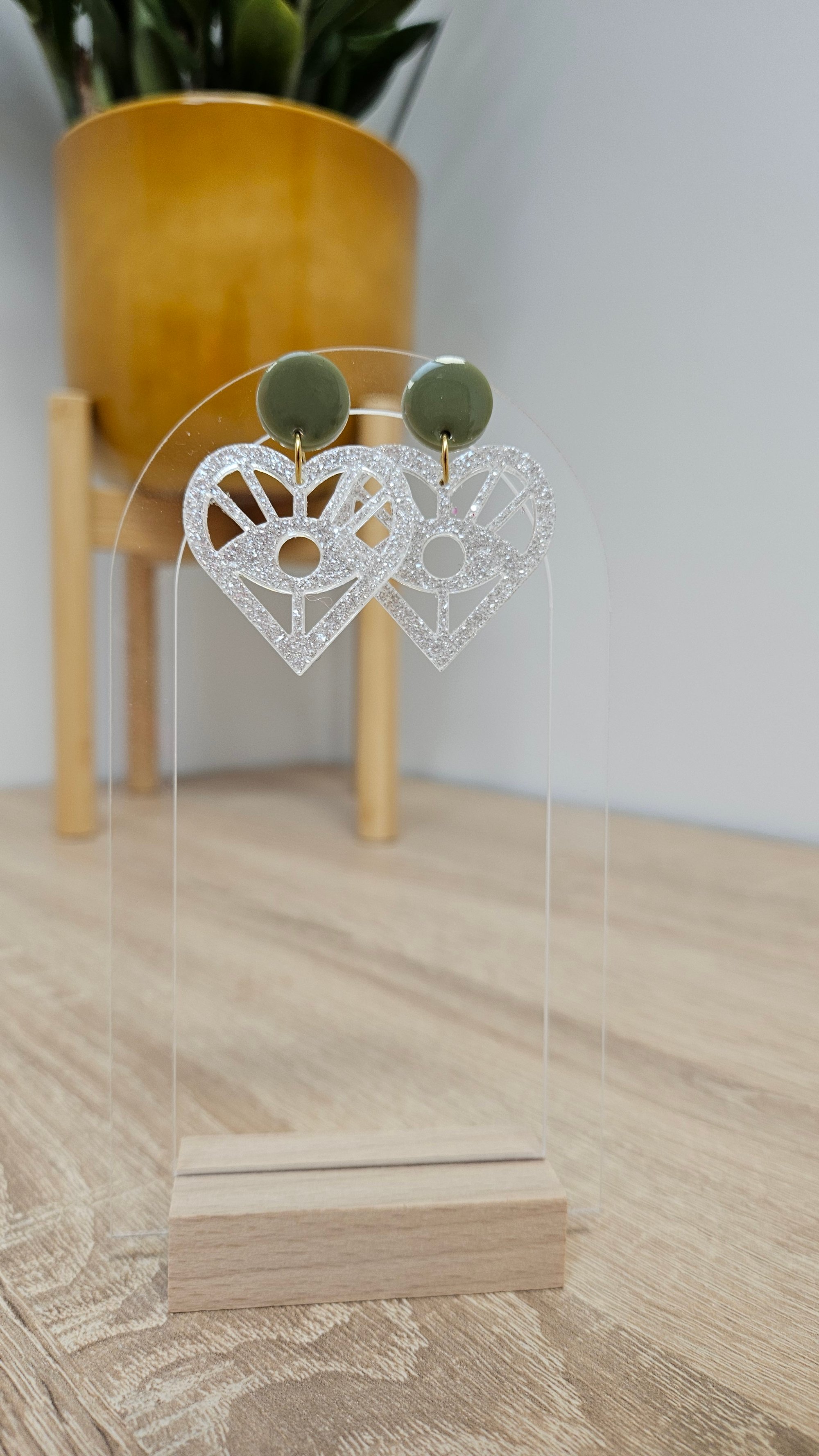 En résine Bio, paillettes végétales ou biodégradables et clou d'oreille en acier inoxydable.