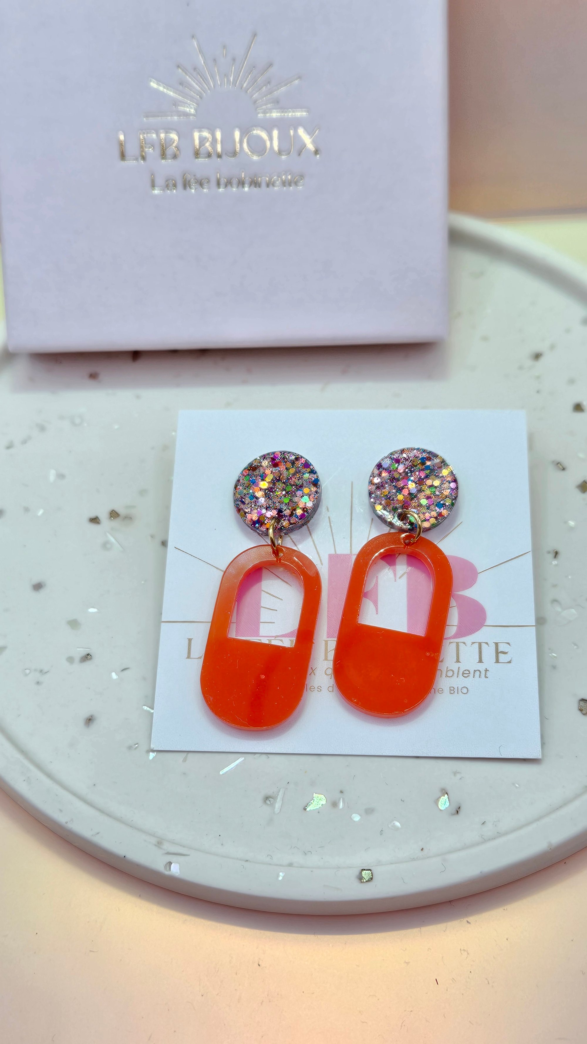 En résine Bio, paillettes végétales/ biodégradables et attaches en acier inoxydable.