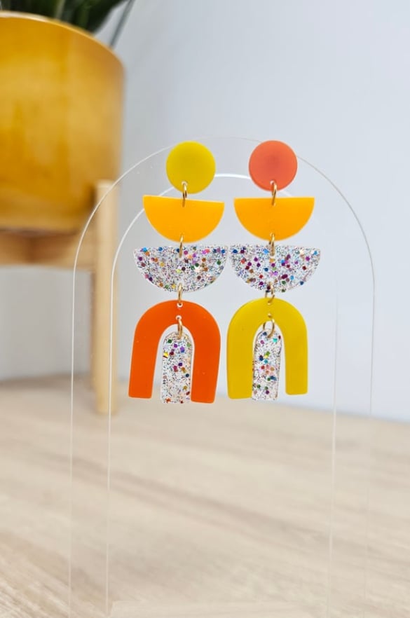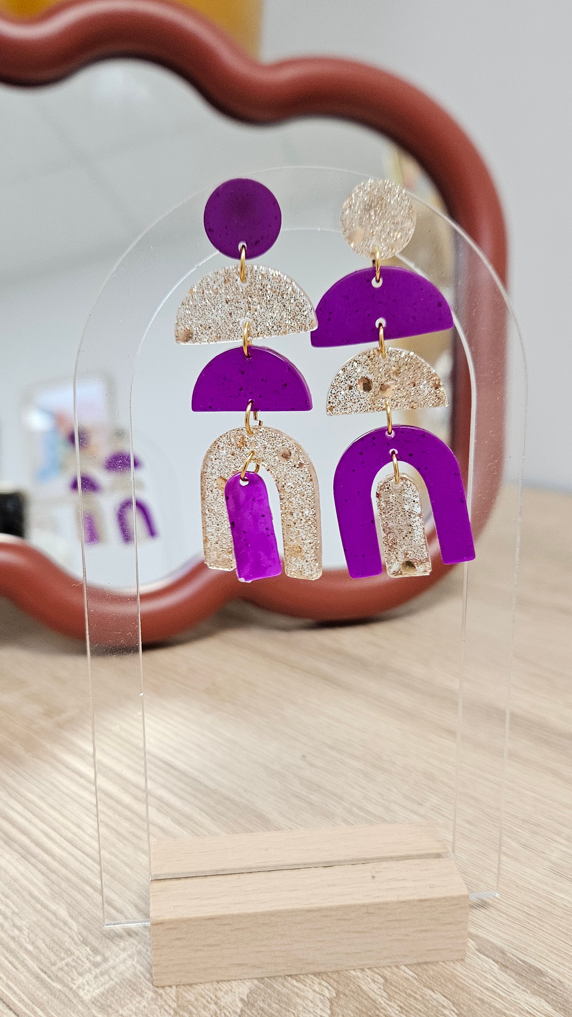 En résine Bio, pigments naturels, paillettes végétales ou biodégradable ou mica. Son attache en acier inoxydable est idéale même pour les plus sensibles.