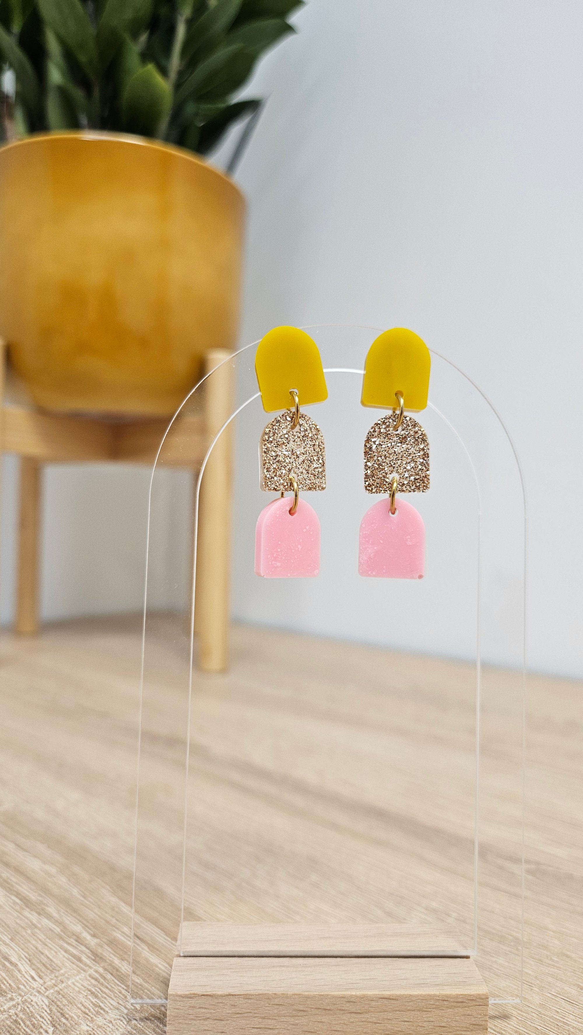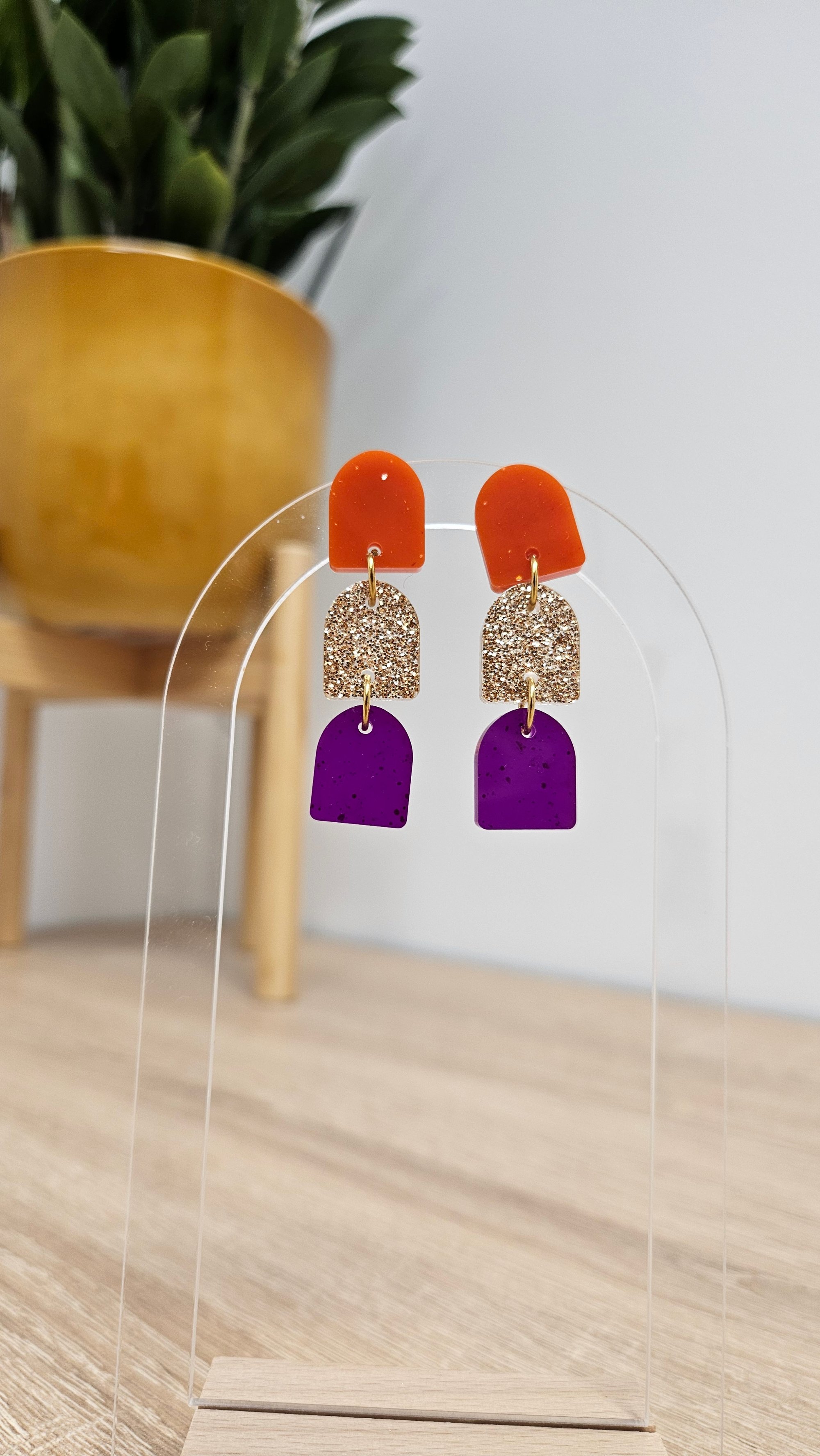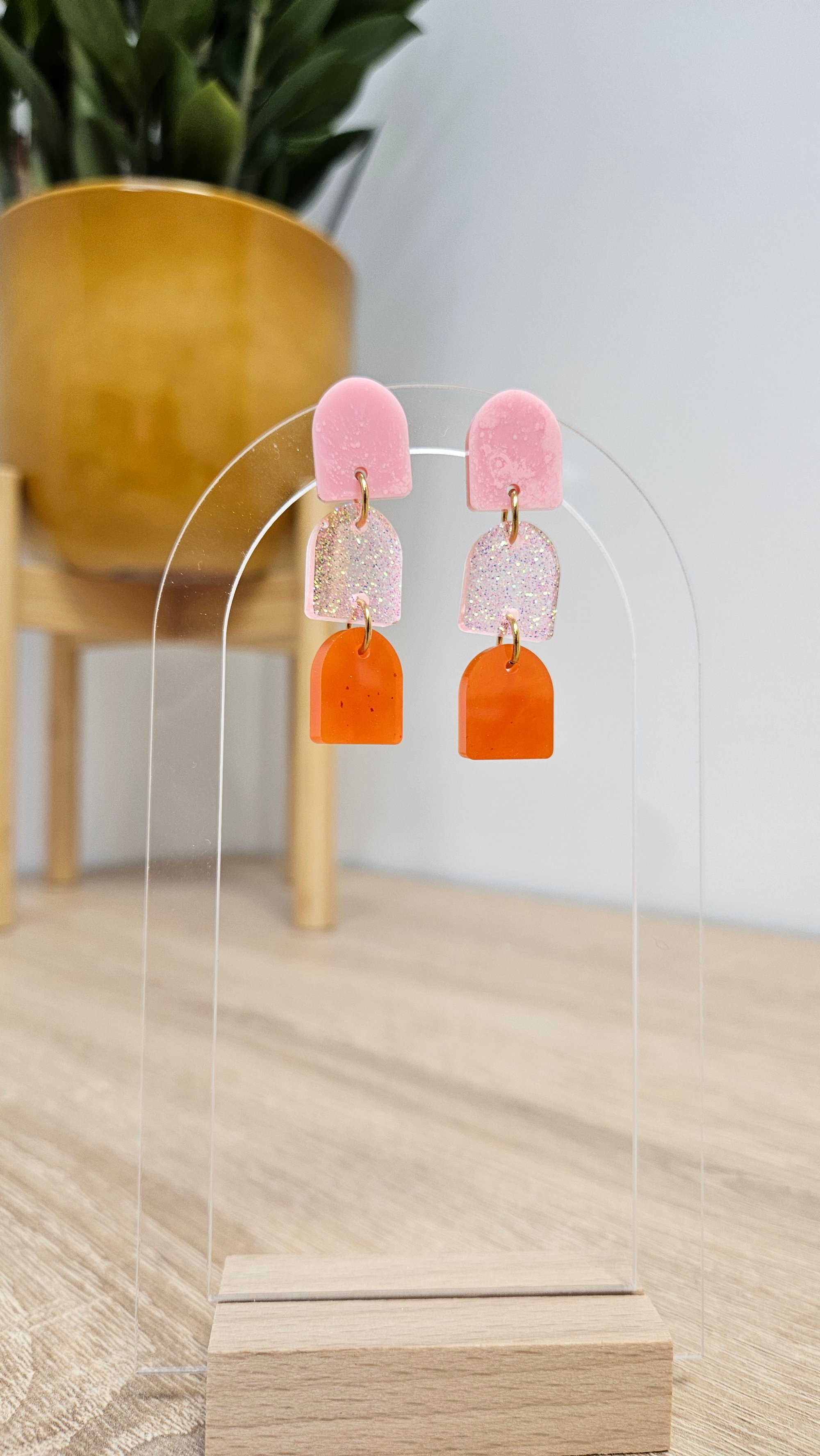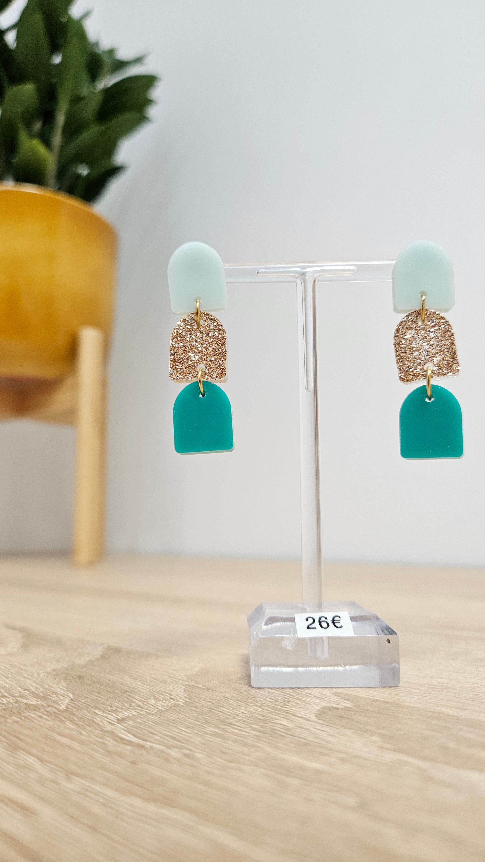 En résine Bio, paillettes végétales ou biodégradables et clou d'oreille en acier inoxydable.
