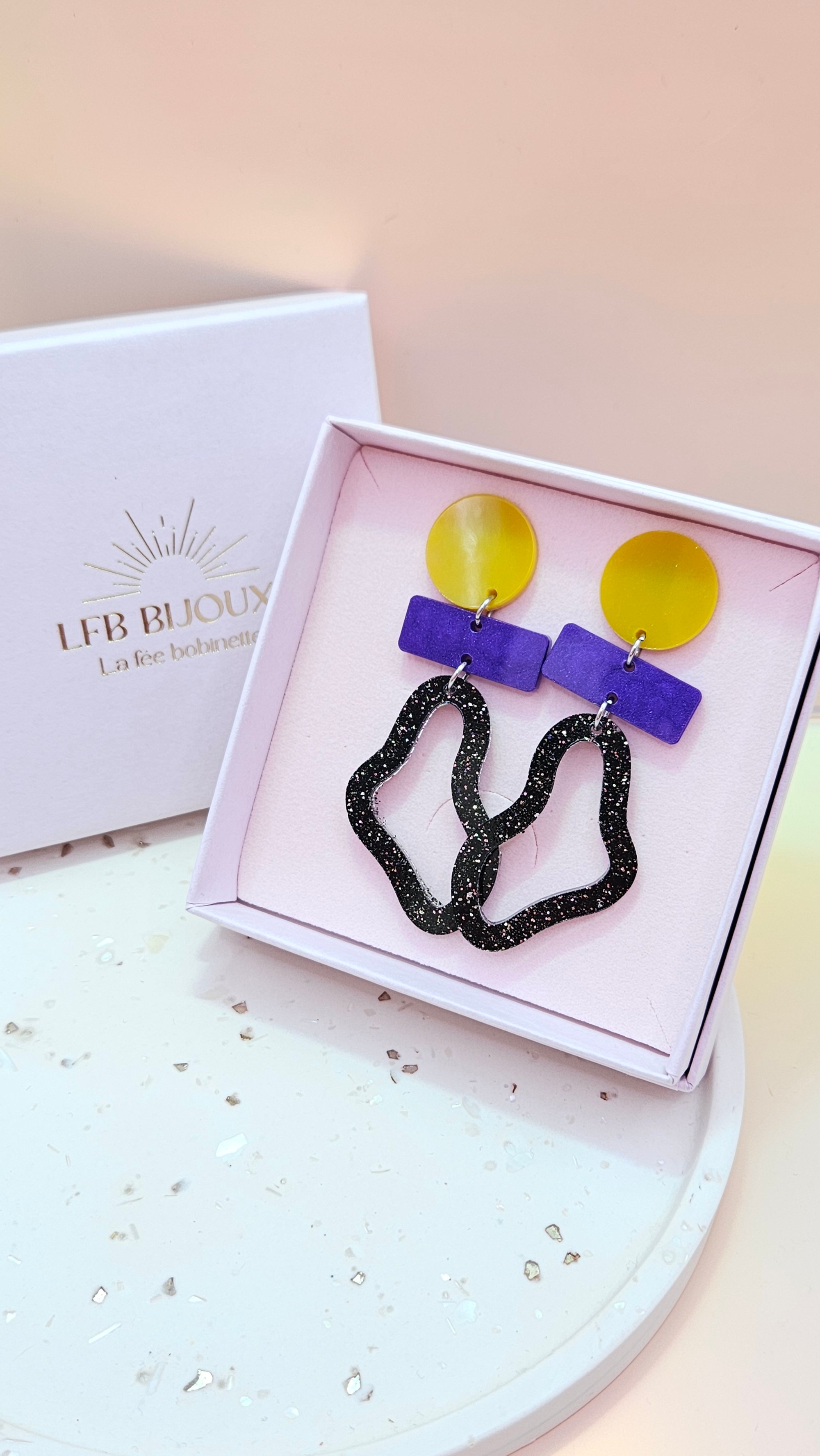 En résine Bio, pigments naturels, paillettes végétales ou biodégradable ou mica. Son attache en acier inoxydable est idéale même pour les plus sensibles.