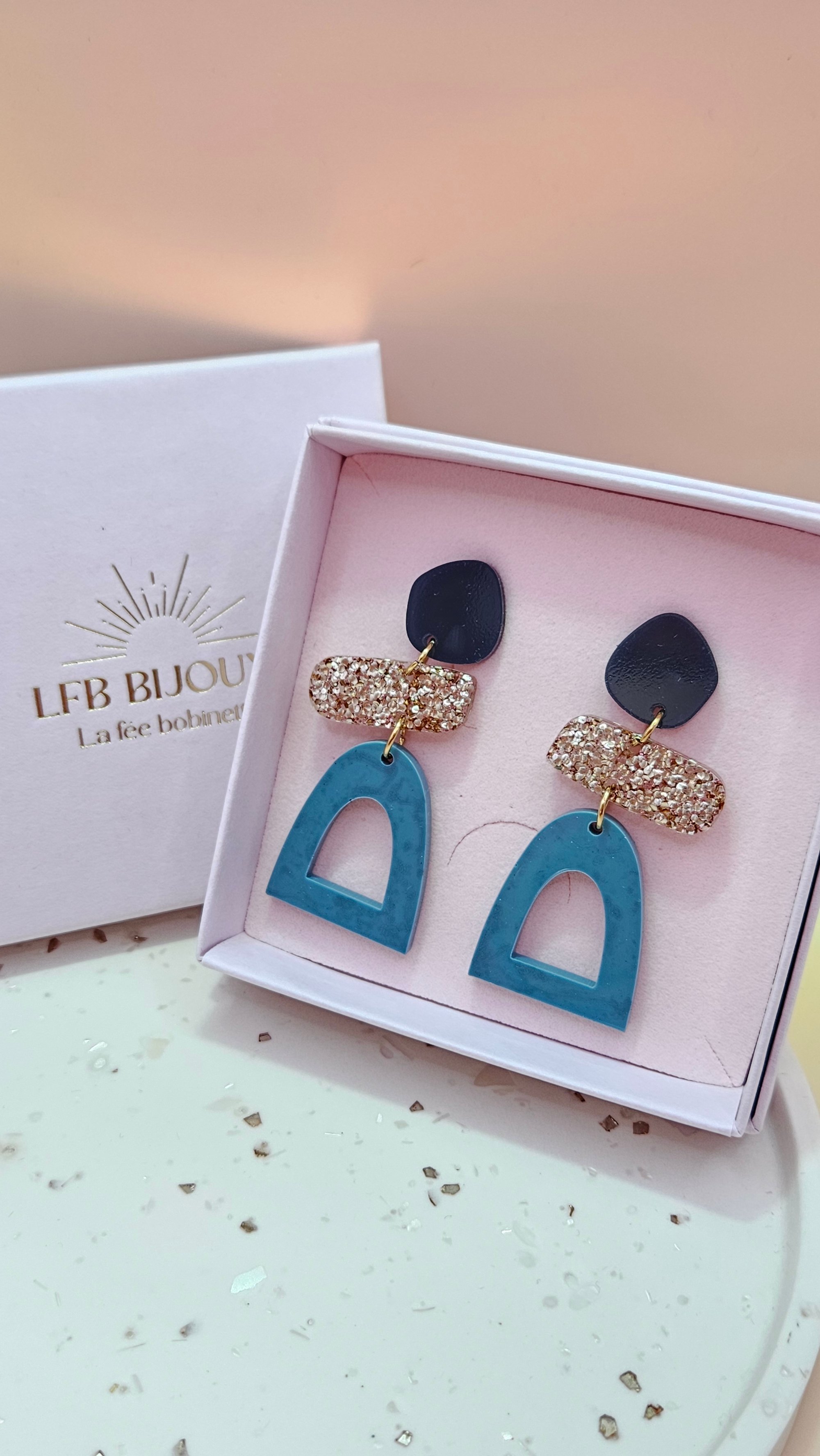 En résine Bio, pigments naturels, paillettes végétales ou biodégradable ou mica. Son attache en acier inoxydable est idéale même pour les plus sensibles.