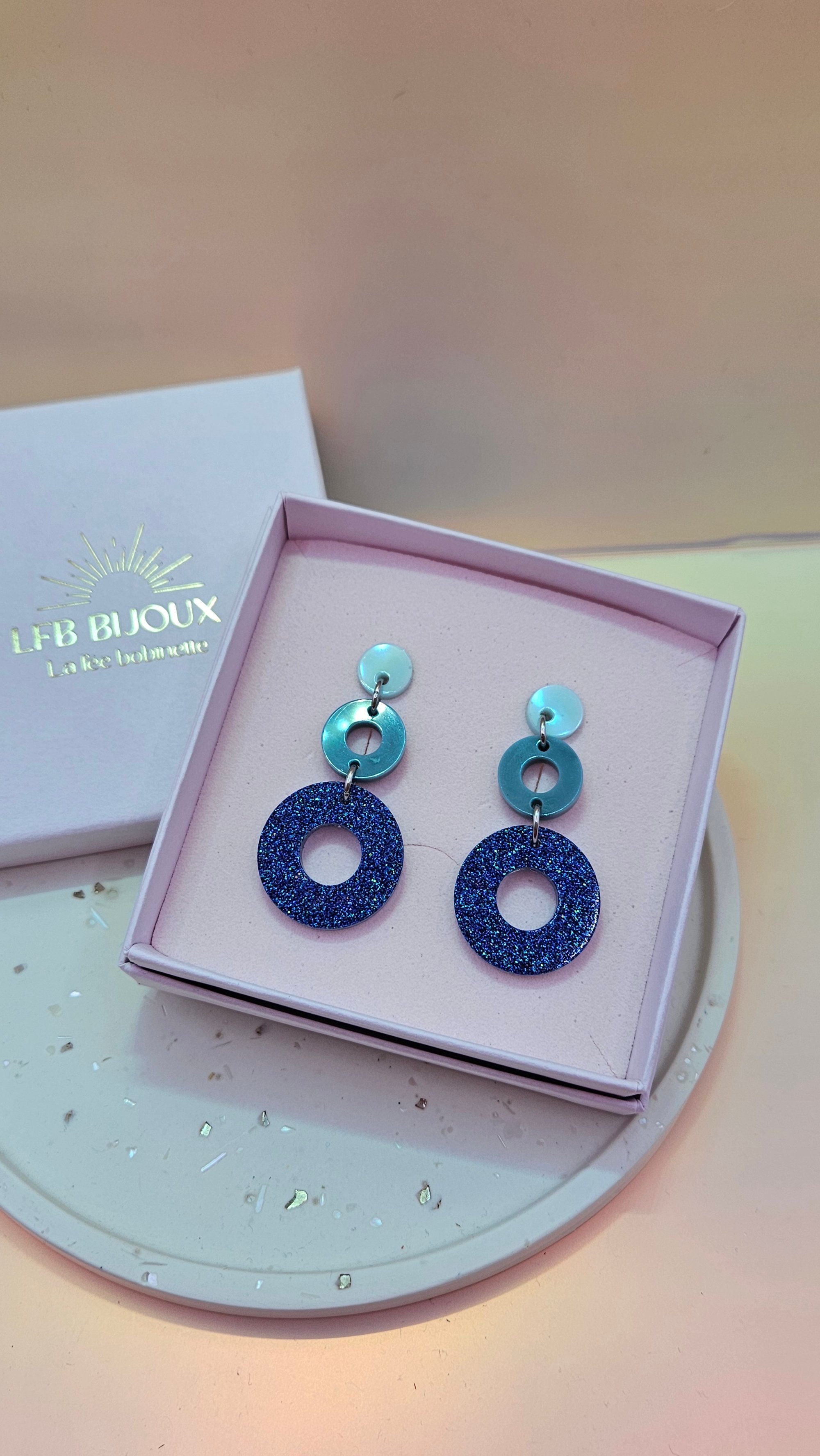 En résine Bio, paillettes végétales ou biodégradable ou mica. Son attache en acier inoxydable est idéale même pour les plus sensibles.