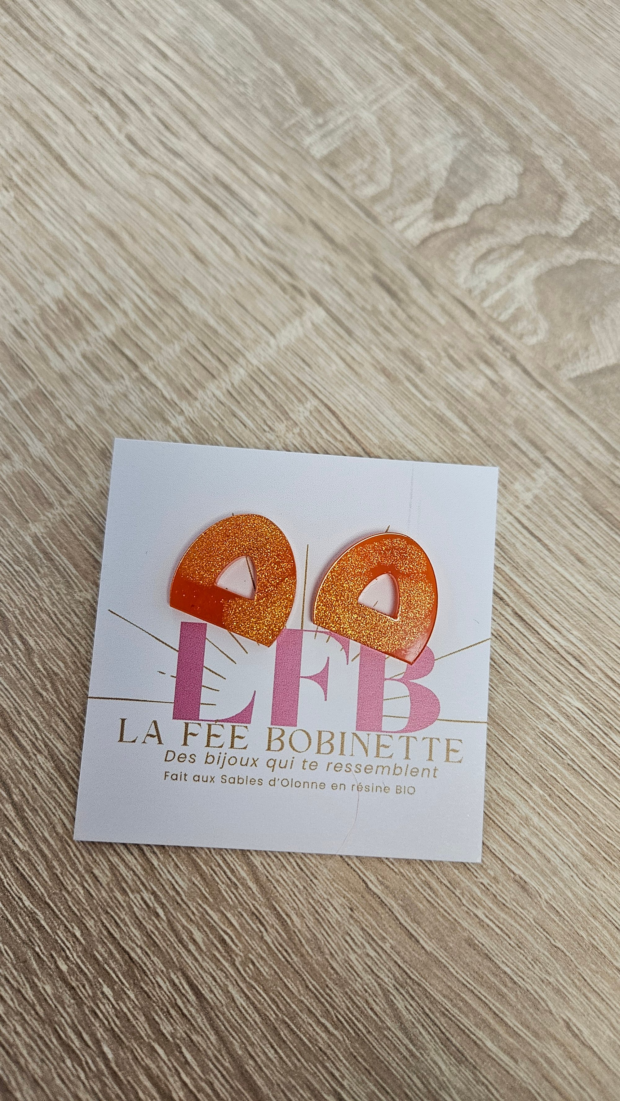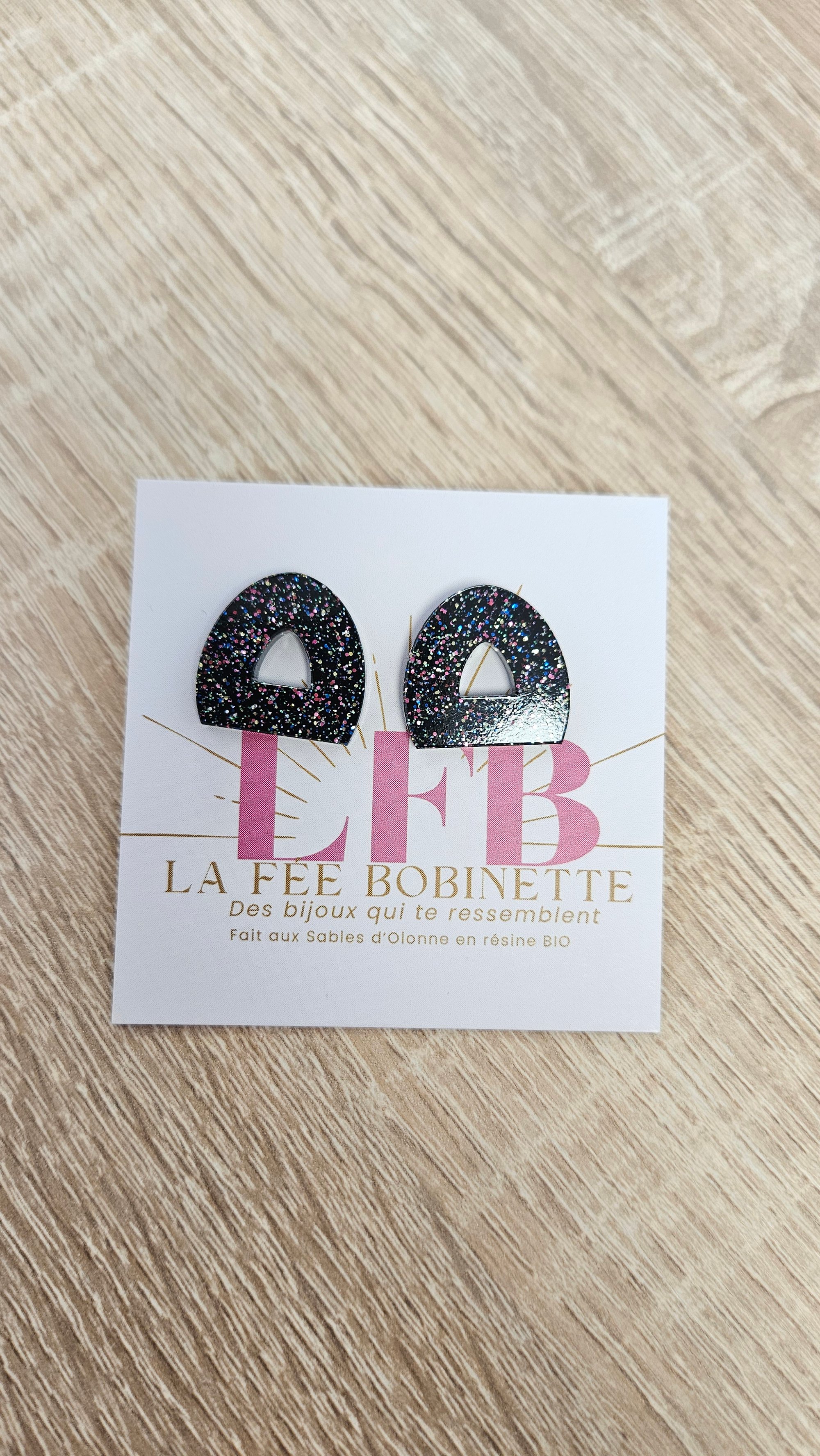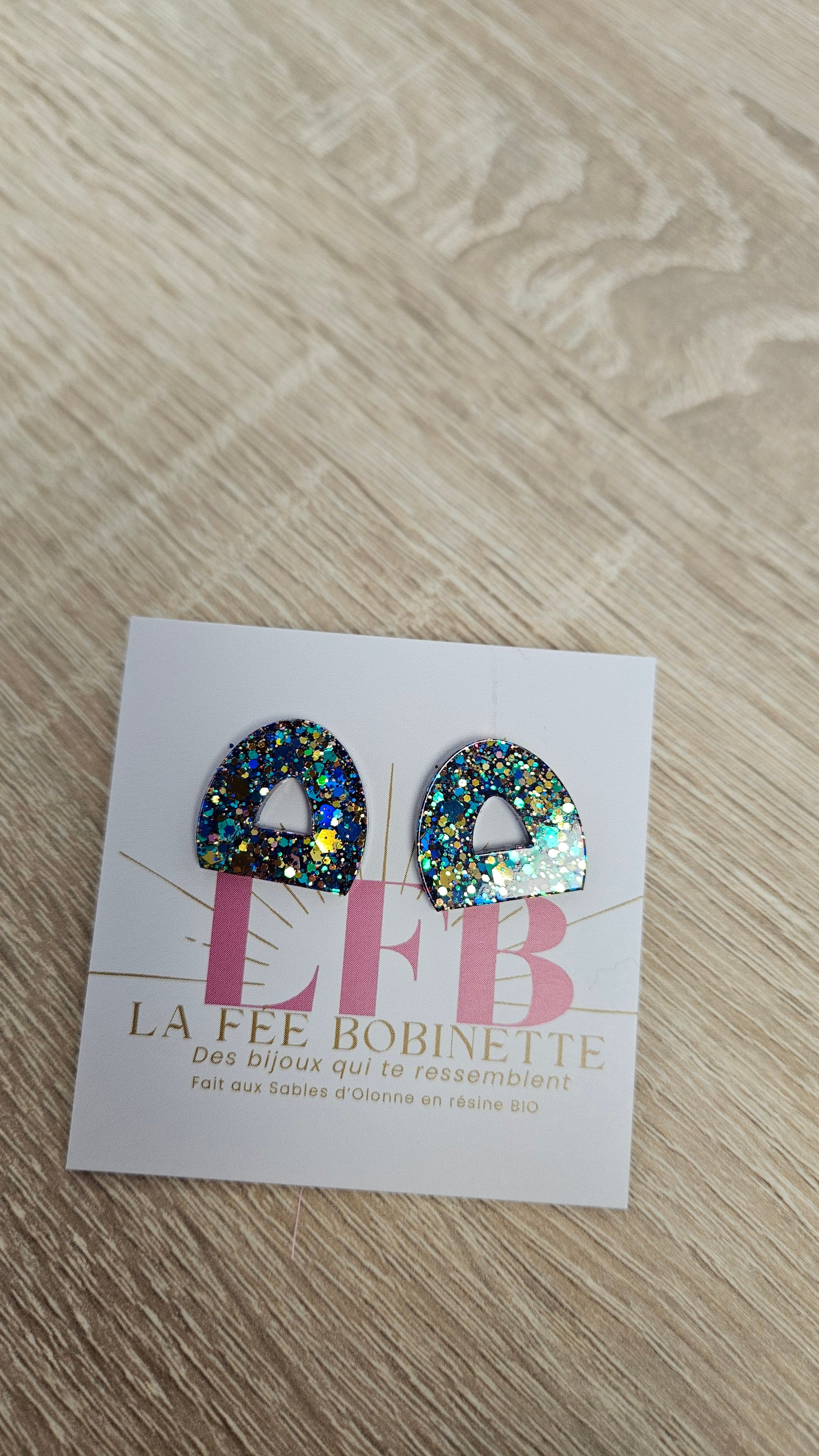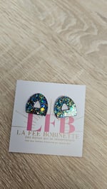 En résine Bio, paillettes végétales ou biodégradables et clou d'oreille en acier inoxydable.