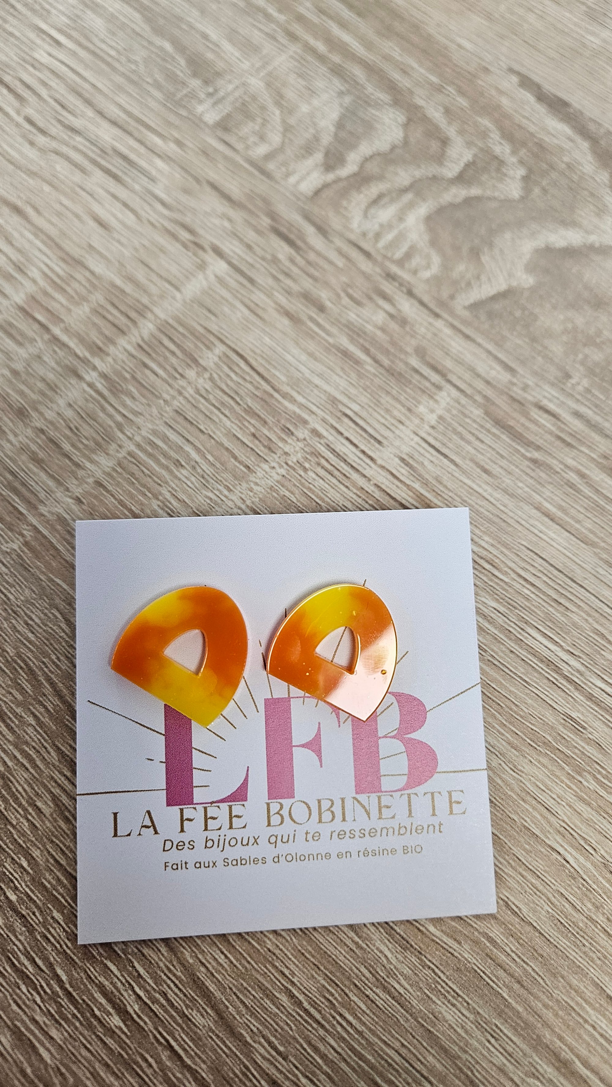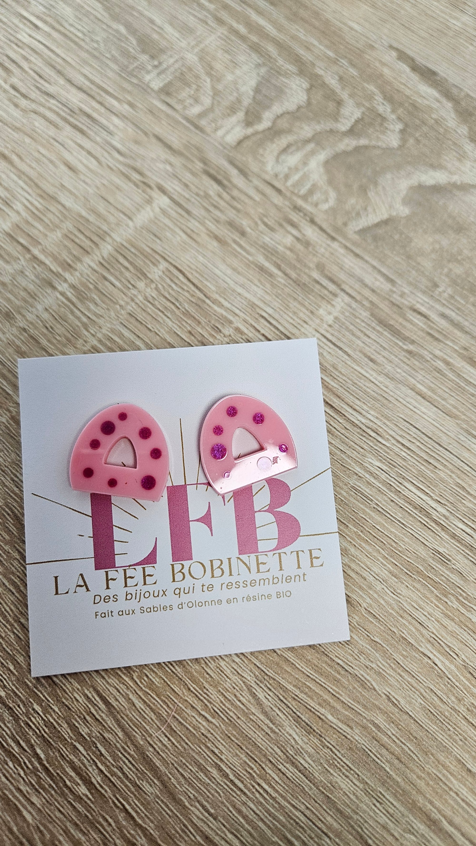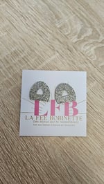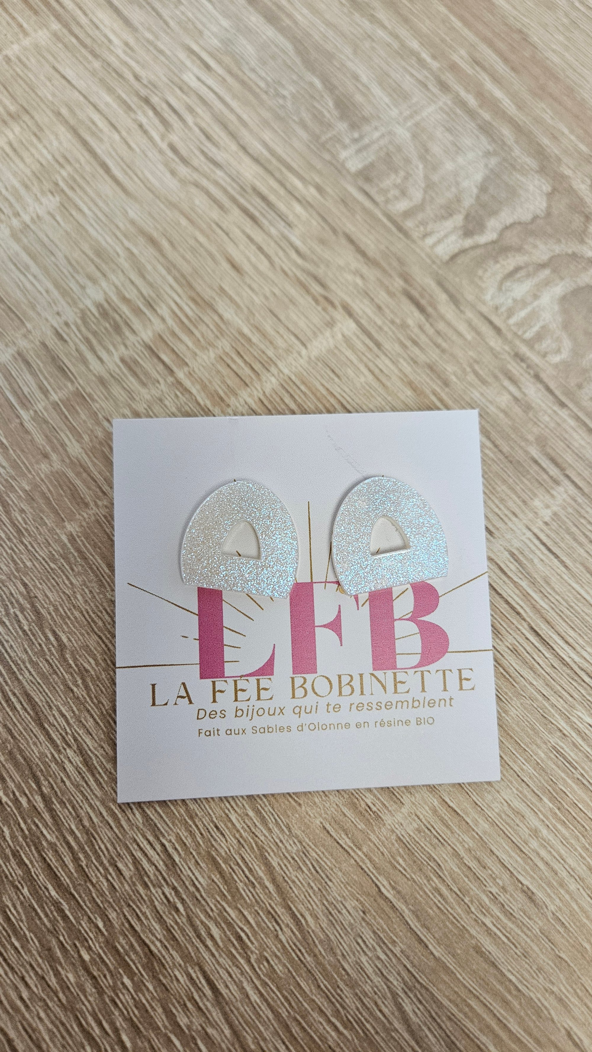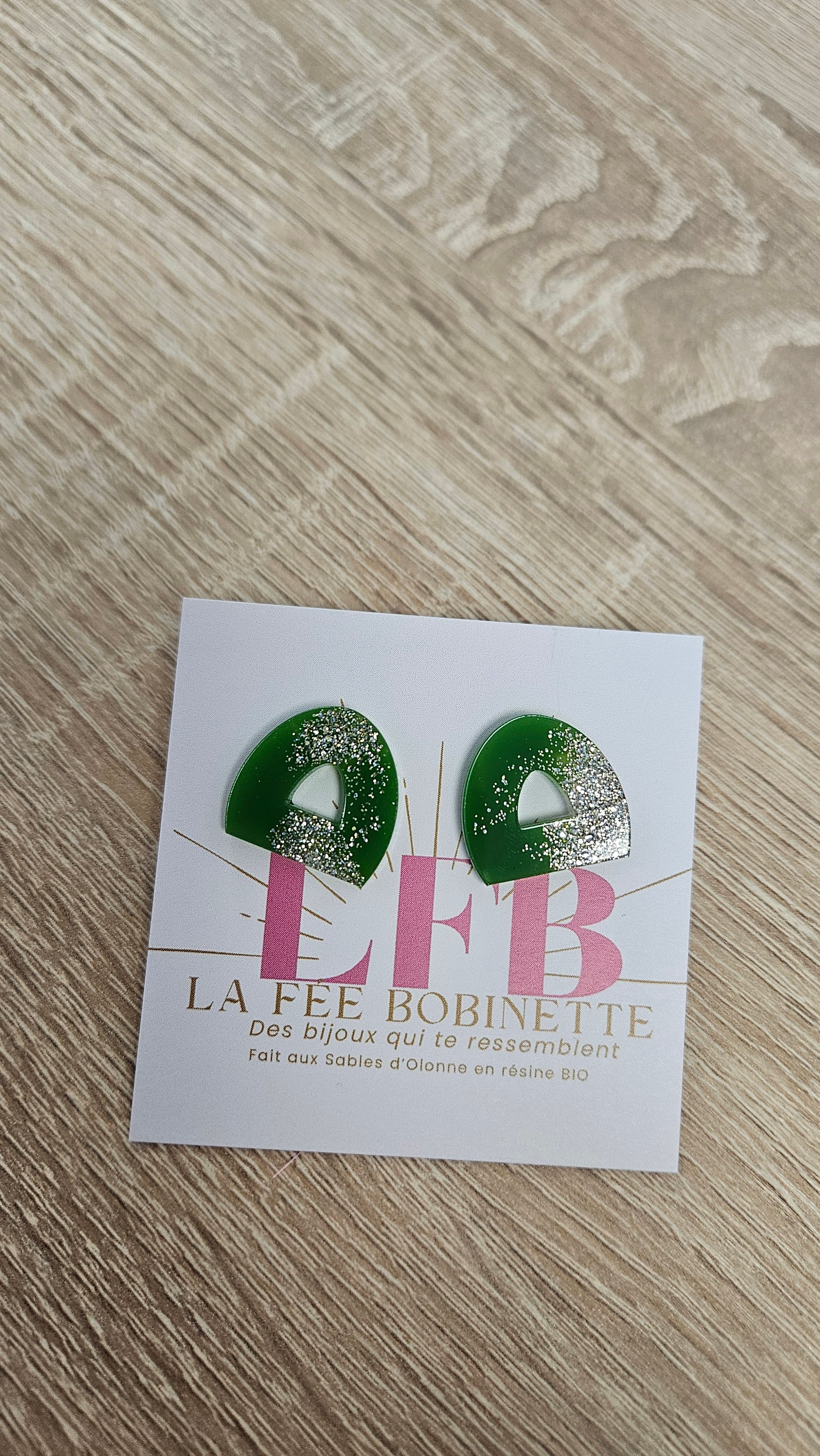 En résine Bio, paillettes végétales ou biodégradables et clou d'oreille en acier inoxydable.