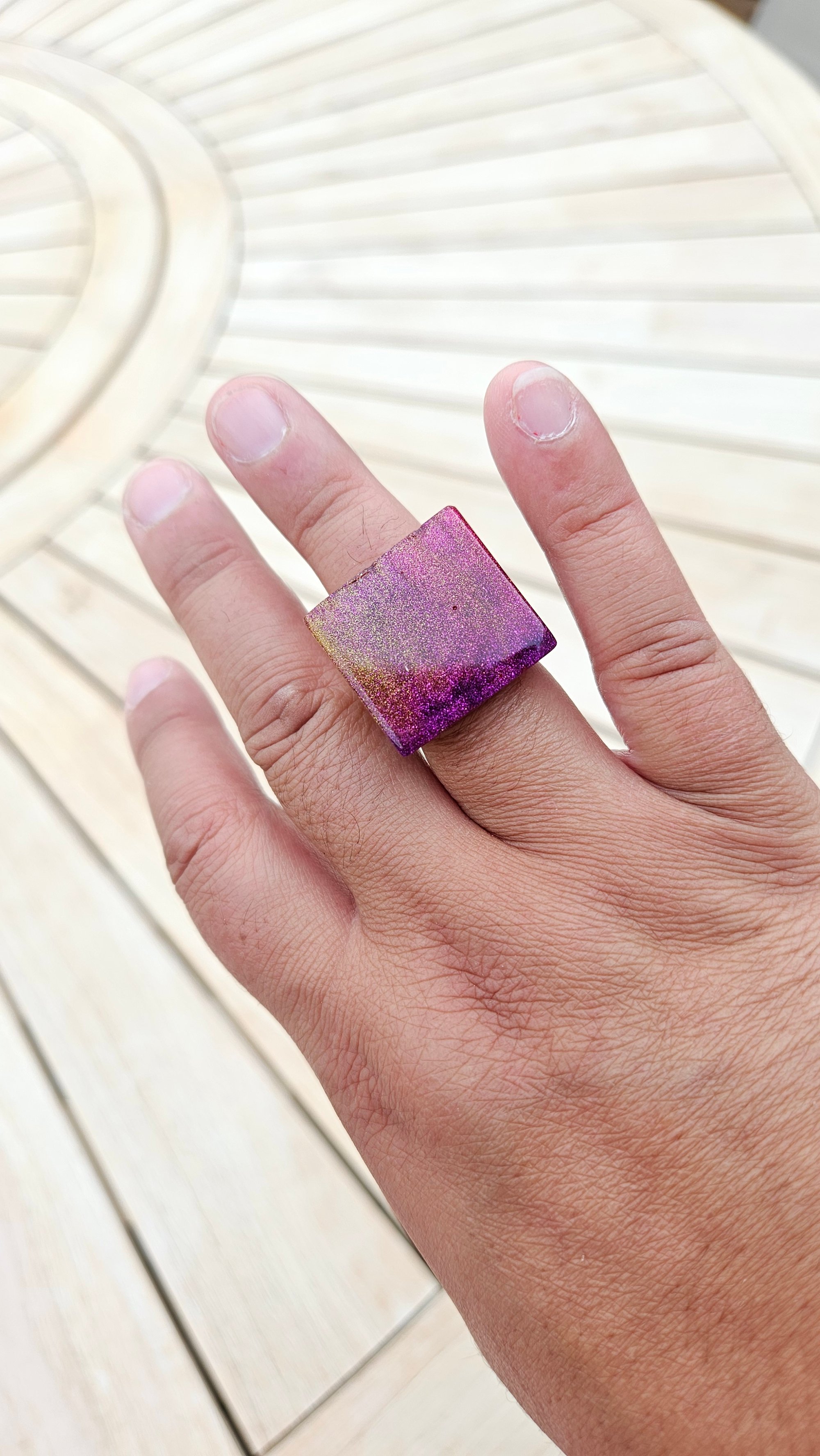 Magnifique bague en résine, elle habillera votre main par sa forme et son style pop' elle nous rappel les années 70 ou même nos années 90 avec sa forme cubique et les couleurs pep's .