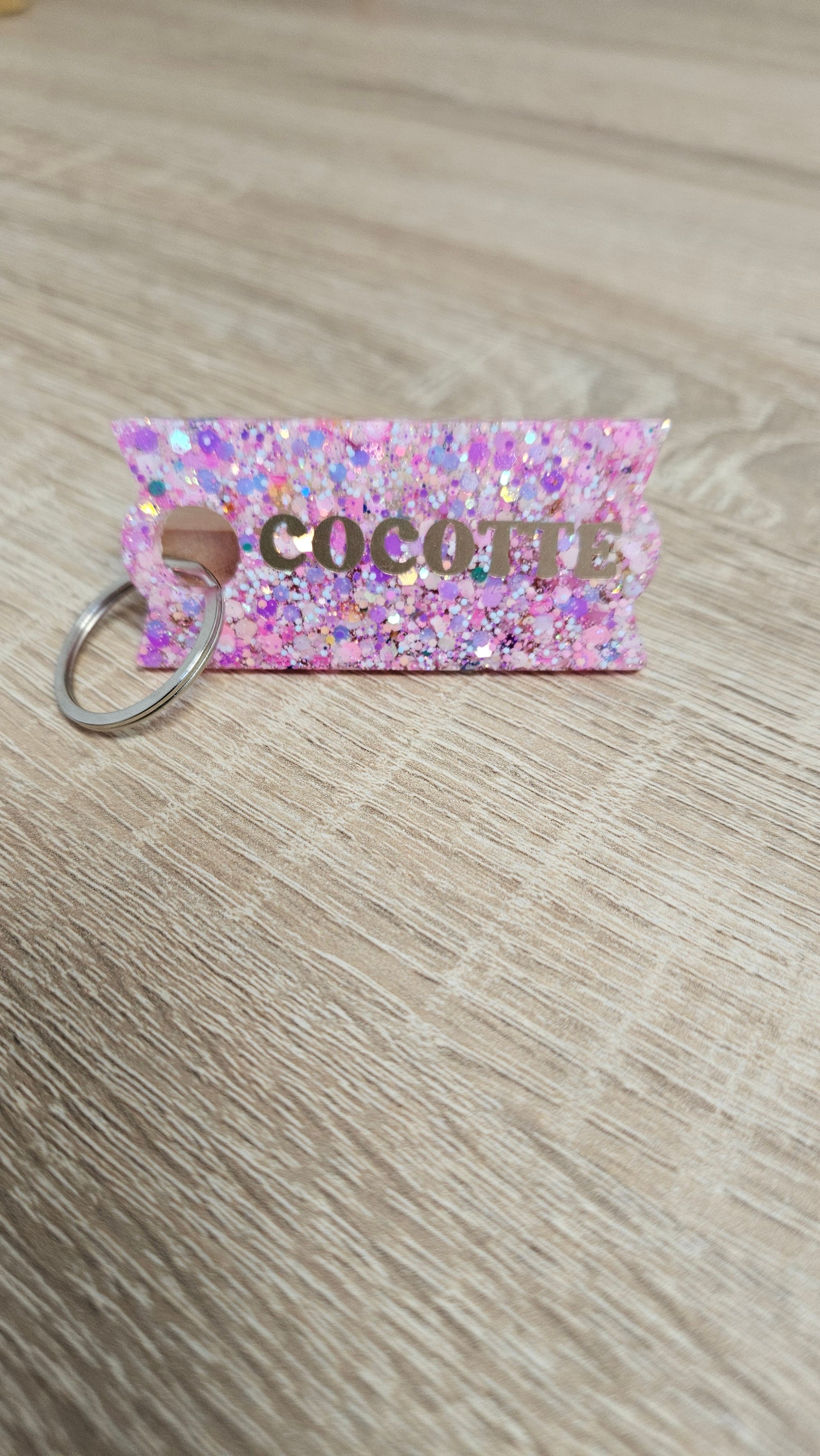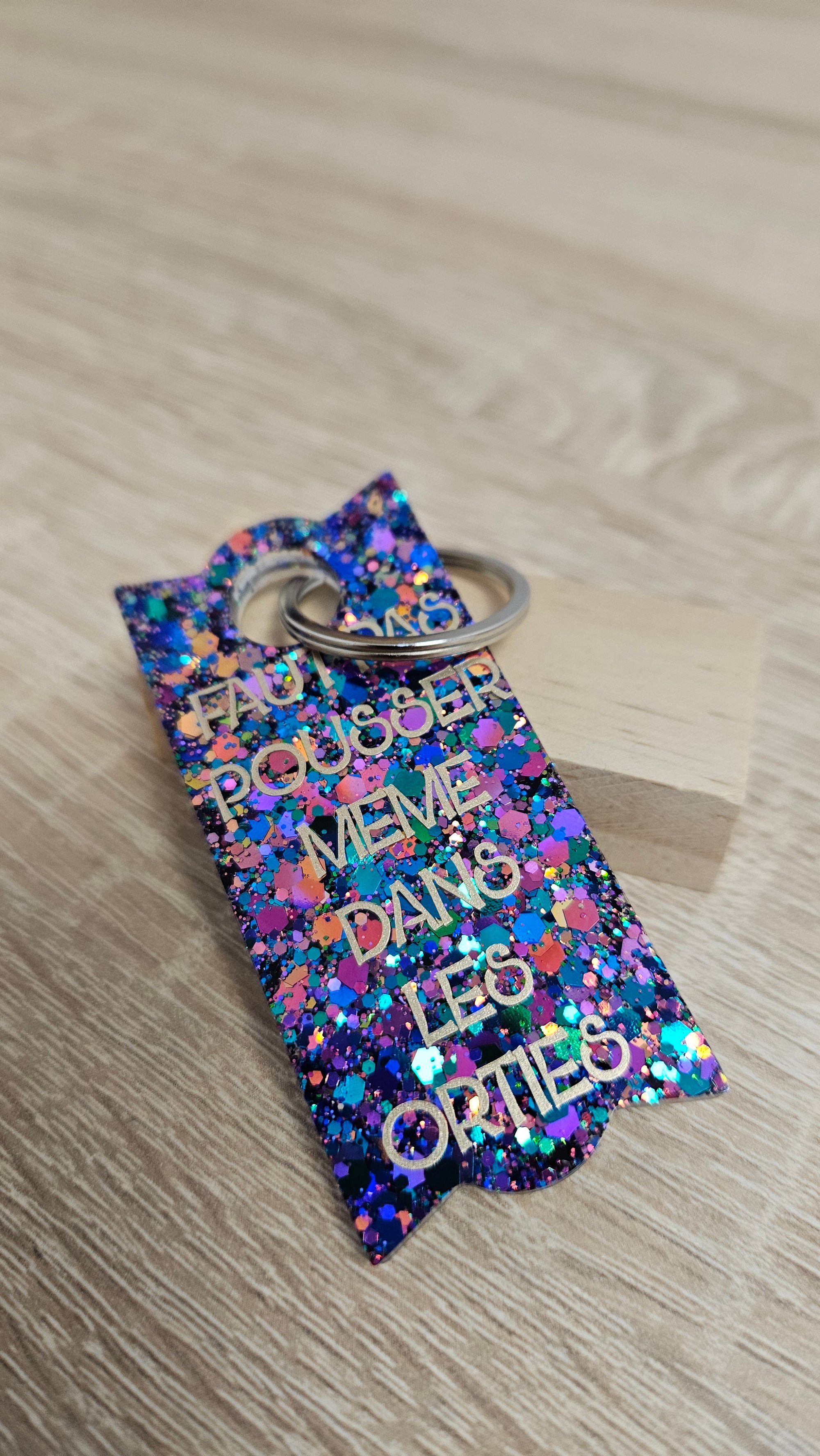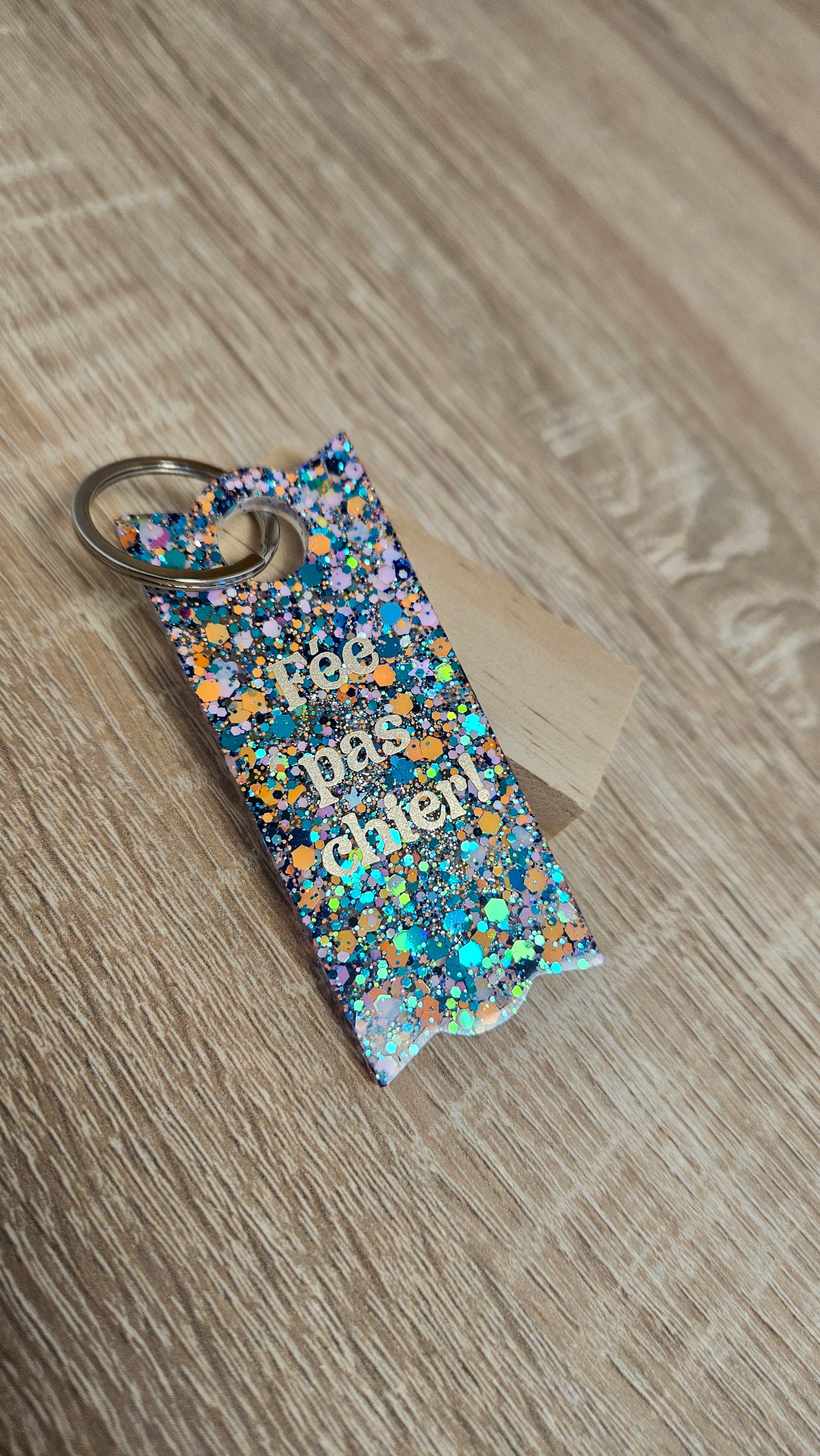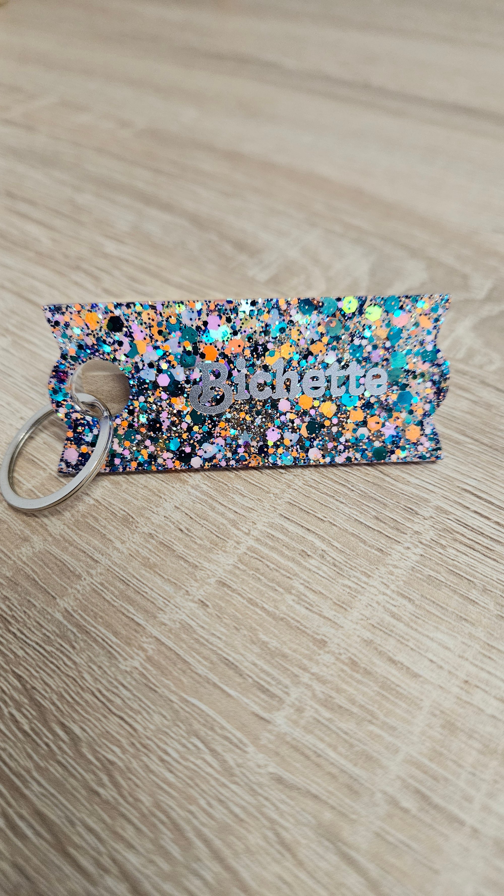 Porte-clés en résine bio et paillettes végétales ou biodégradables.