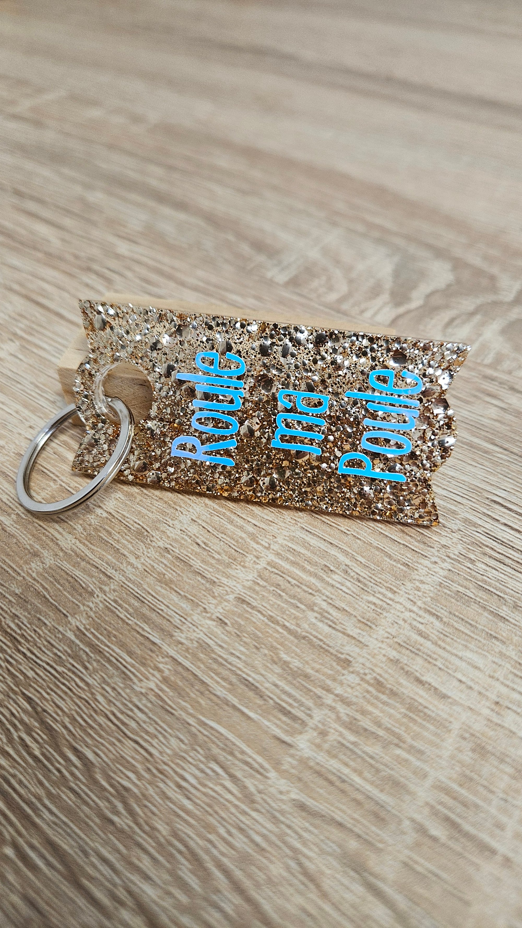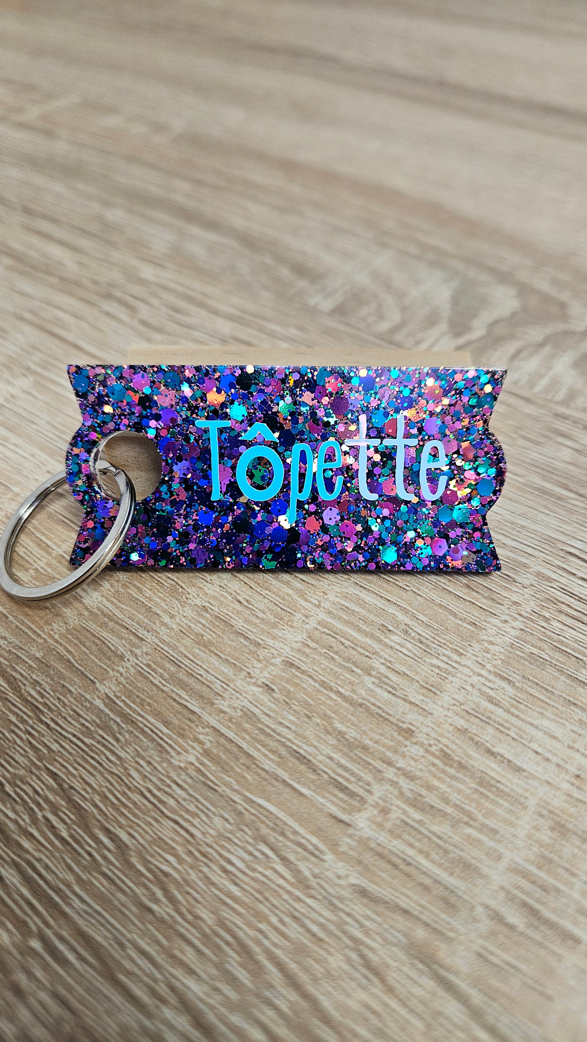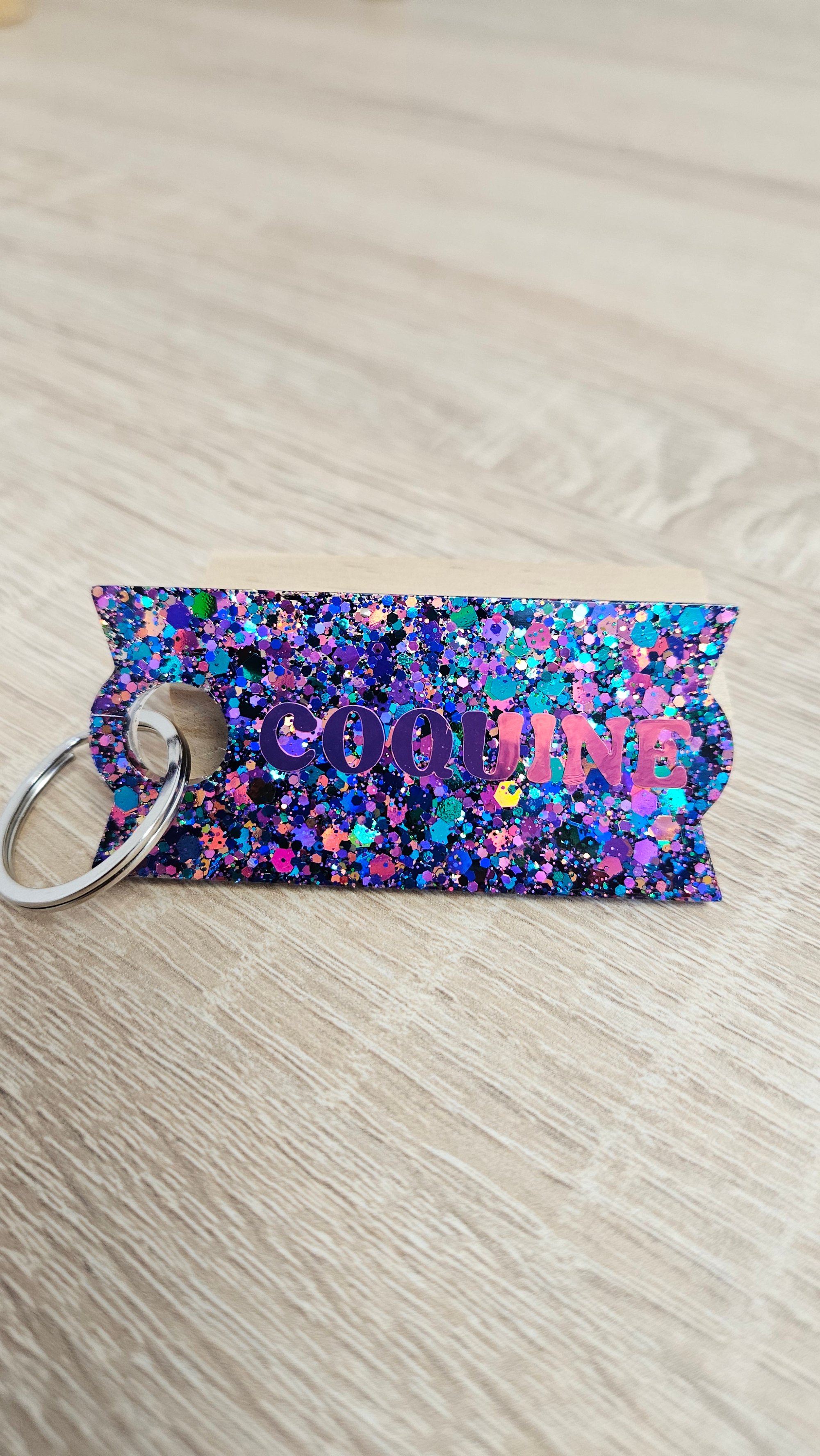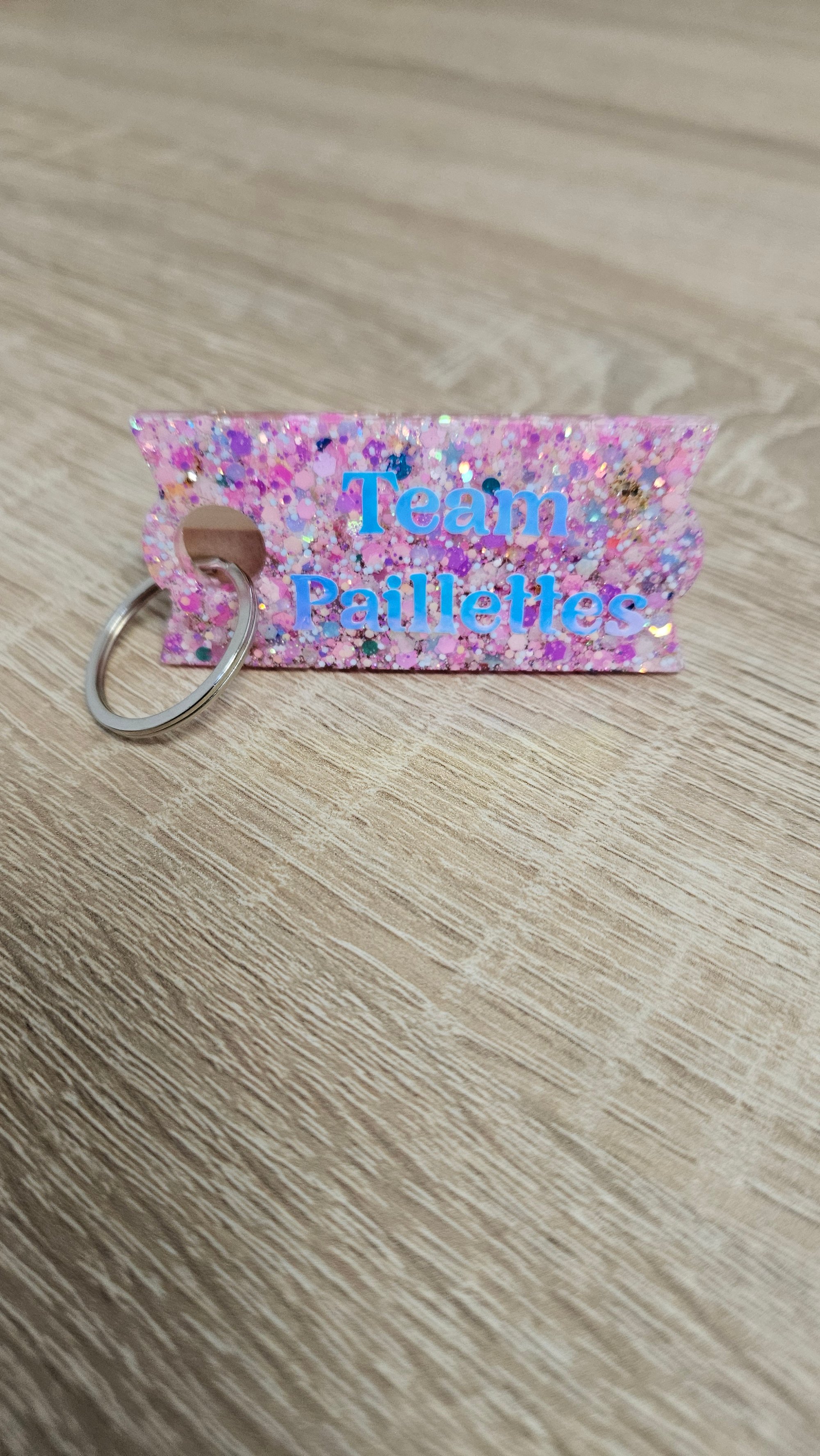 Porte-clés en résine bio et paillettes végétales ou biodégradables.