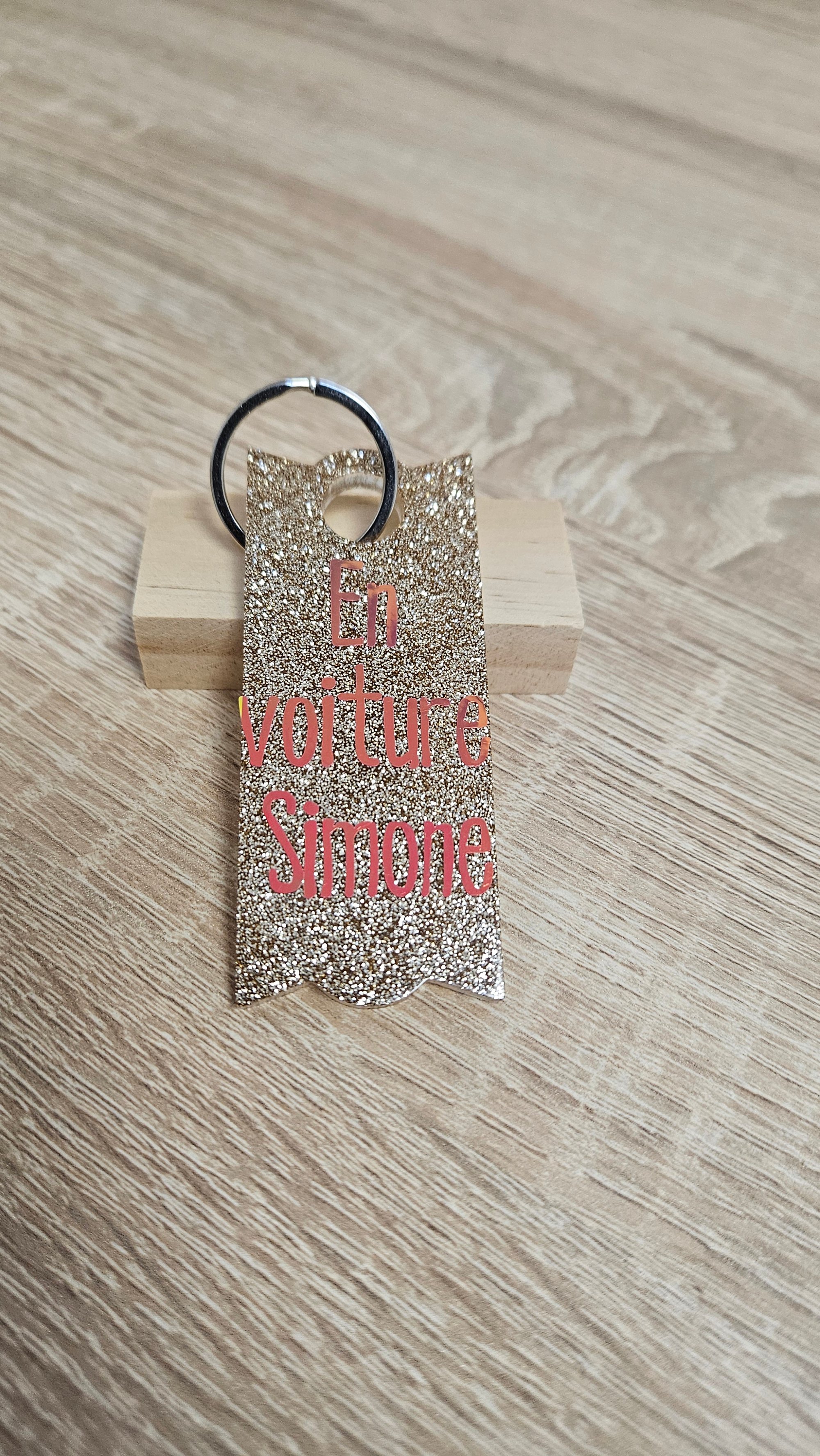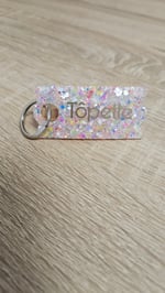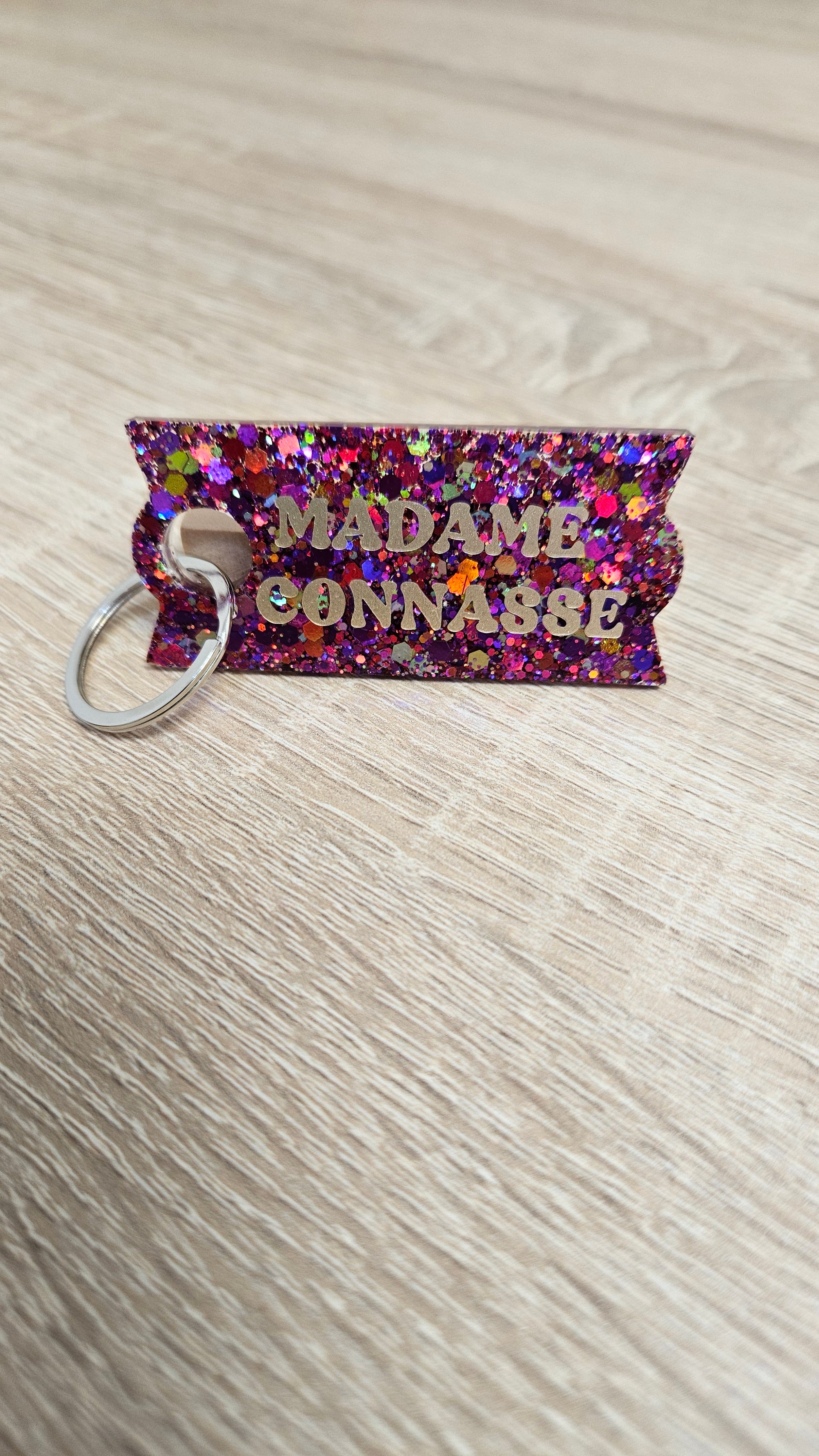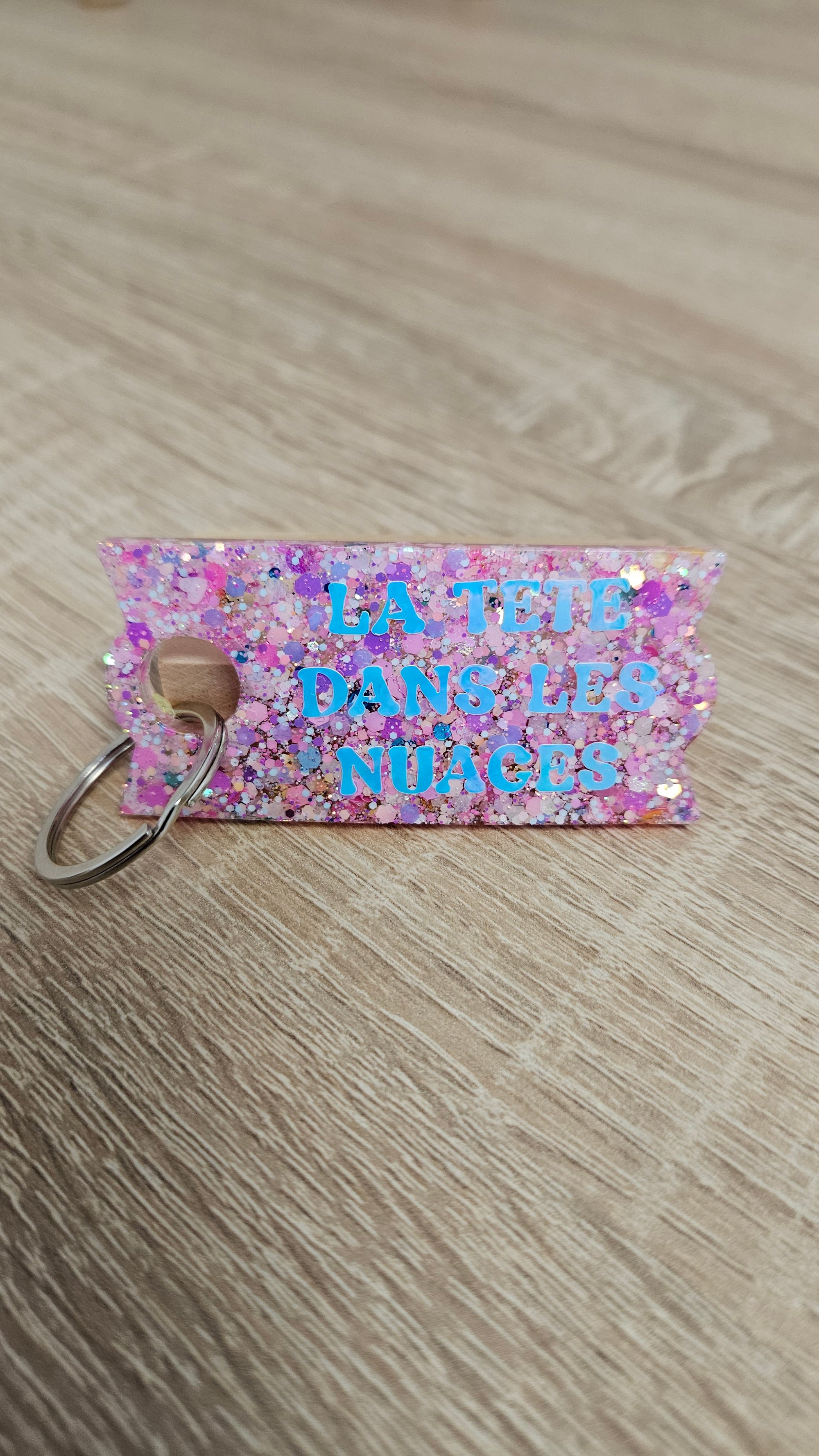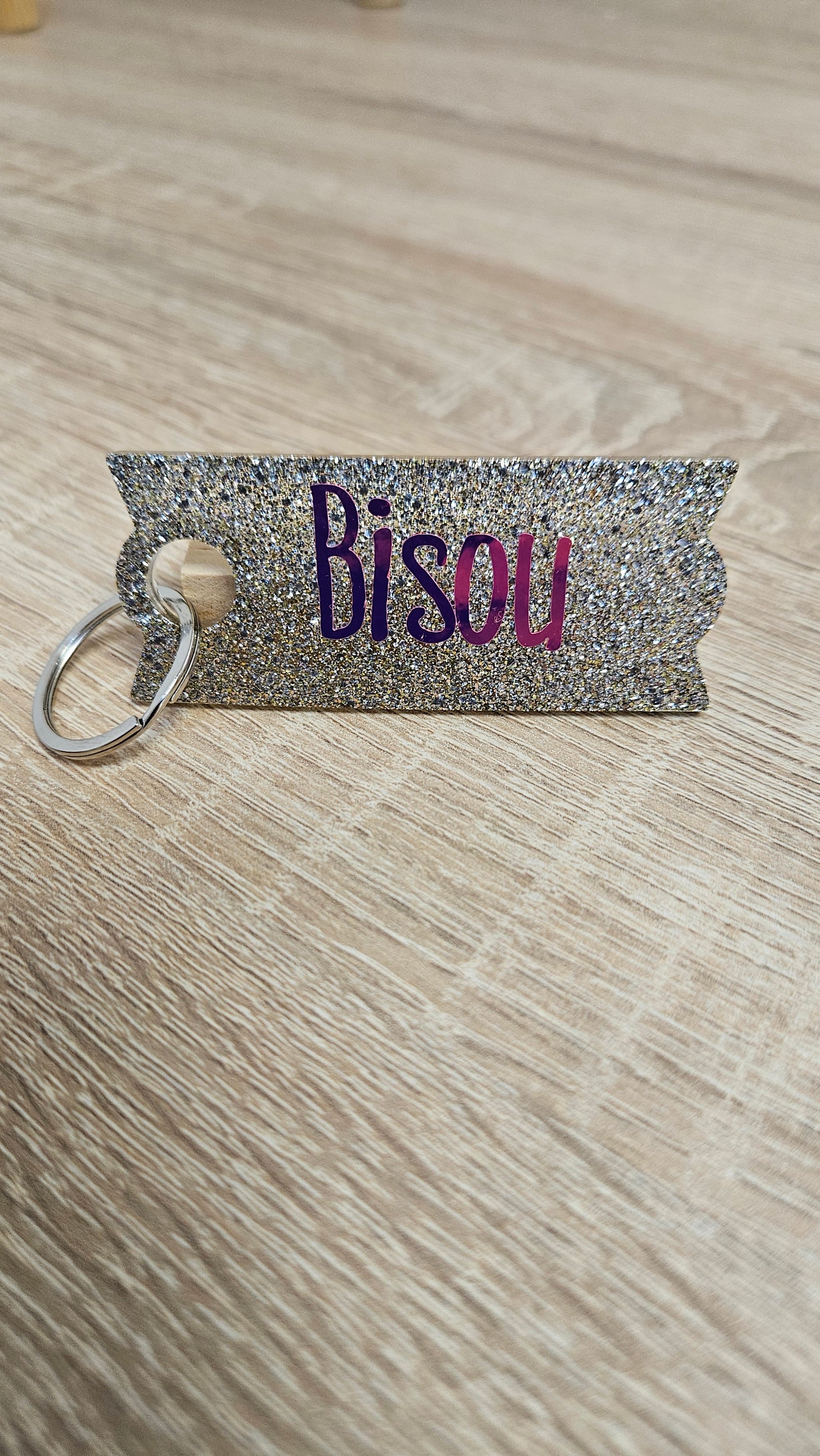 Porte-clés en résine bio et paillettes végétales ou biodégradables.